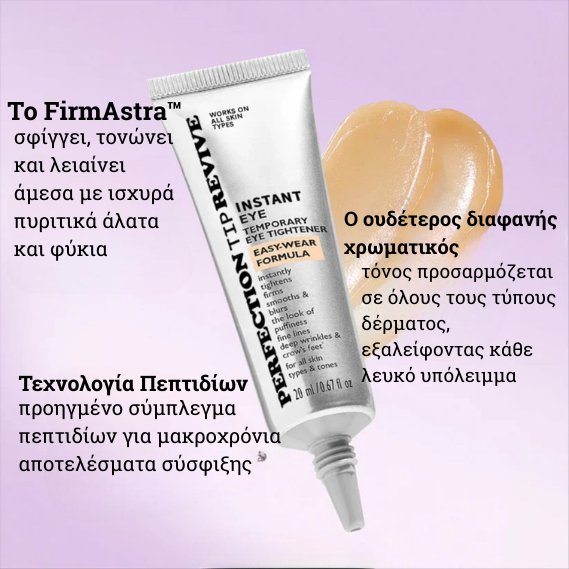 Η προηγμένη φόρμουλα με το σύμπλεγμα FirmAstra™ δρα άμεσα, μειώνοντας το πρήξιμο και λειαίνοντας τις ρυτίδες γύρω από τα μάτια. Η επιδερμίδα γίνεται πιο απαλή και ενυδατωμένη, έτοιμη για άψογο μακιγιάζ.